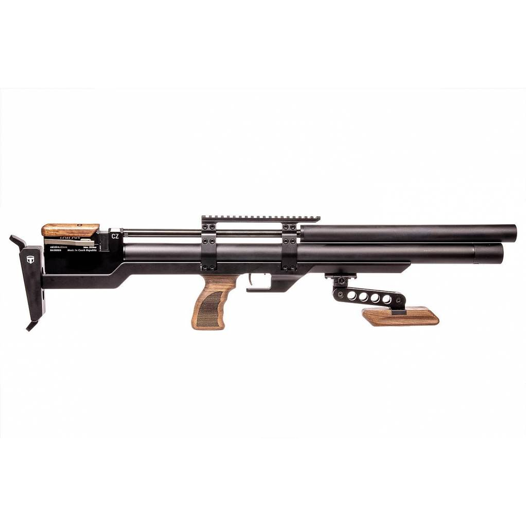 La empuñadura de pistola tiene forma ergonómica y está hecha de madera de nogal. El cartucho tiene una capacidad de 291 cc de aire y está equipado con un manómetro Wika.